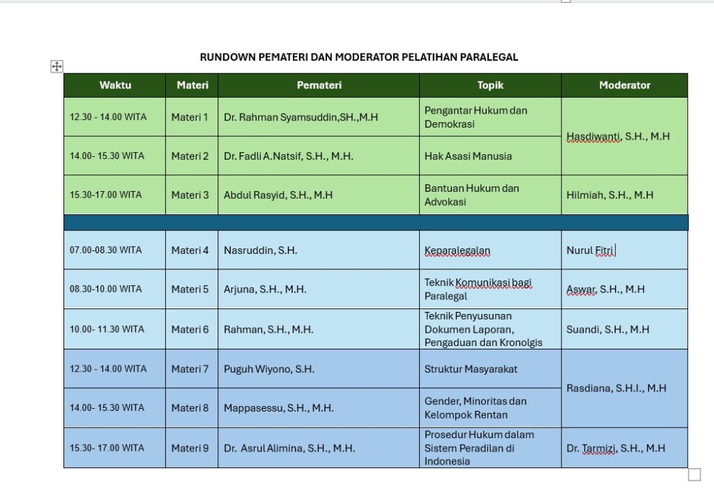 Pelatihan ini merupakan hasil kolaborasi antara UIN Alauddin, Kantor Wilayah Kementerian Hukum Sulawesi Selatan, Lembaga Bantuan Hukum (LBH) Cita Keadilan Makassar, serta Pemerintah Kota Makassar. Kegiatan tersebut diikuti 149 peserta, adapun yang aktif 138 mahasiswa dan dilaksanakan setiap hari mulai pukul 07.00 hingga 17.00 WITA sebagai bagian dari pemenuhan kurikulum pelatihan paralegal.